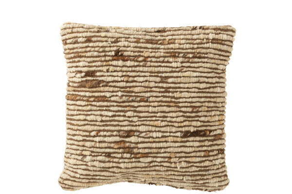 Textured brown and beige pillow with frayed edges on a beige sofa.